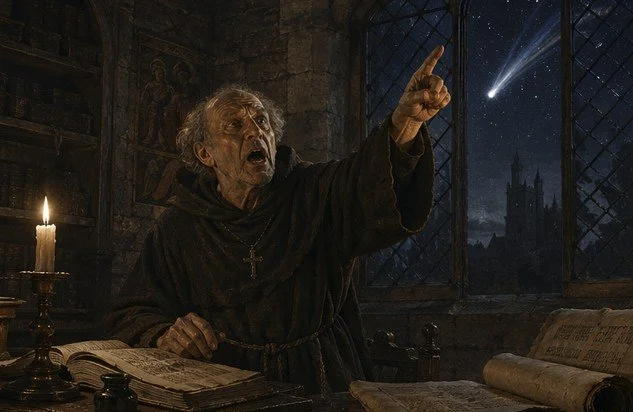 On the 24th of April 1066, the comet became visible in the British Isles, and at Malmesbury Abbey, an elderly Benedictine monk named Eilmer looked up at the blazing tail and had a premonition.