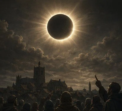 A major solar eclipse crossed northern Europe — described in the Welsh chronicle as the sun changing its colour; documented in the Chronicle of Melrose as a moment when stars appeared in the daytime sky. In the novel, this eclipse falls on the day of the funeral of one of Nicola’s children, plunging the graveyard into an unnatural twilight at the very moment his coffin is lowered into the ground.
