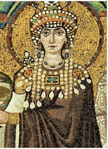 Depiction of the Empress Theodora from a contemporary portrait mosaic in the Basilica of San Vitale, Ravenna