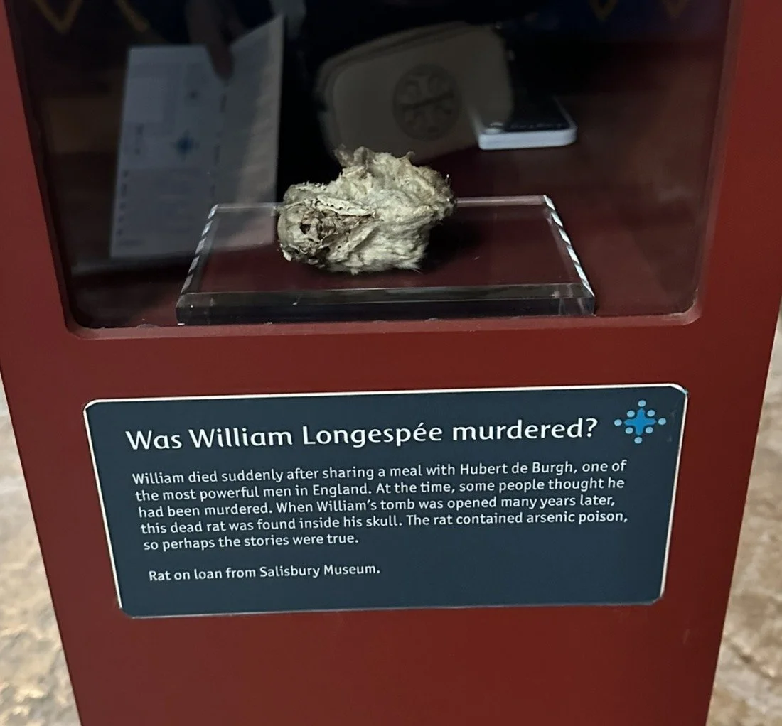 When Longespée’s tomb was opened, an eerie detail emerged: a rat skeleton trapped inside the earl’s skull. Later testing revealed arsenic in the rat’s bones, giving chilling new life to the medieval whispers that the great earl had been poisoned.