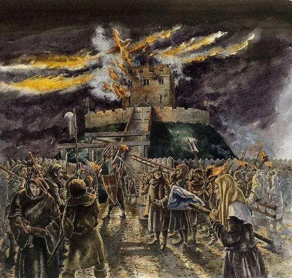 A depiction of the antisemitic mob and the tower at York Castle, where the local Jews had taken refuge in 1190, burning